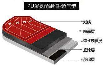 透氣型塑膠球場塑膠跑道又稱全天候田徑運動跑道,由聚氨酯預聚體、混合聚醚、廢輪胎橡膠、EPDM橡膠粒或PU顆粒、顏料、助劑、填料組成;具有平整度好、抗壓強度高、硬度彈性適當、物理性能穩定、抗紫外線耐老化性佳、耐水耐候性強、表面止滑、清潔容易(高壓水沖洗即可)、維護修補簡單等特性。