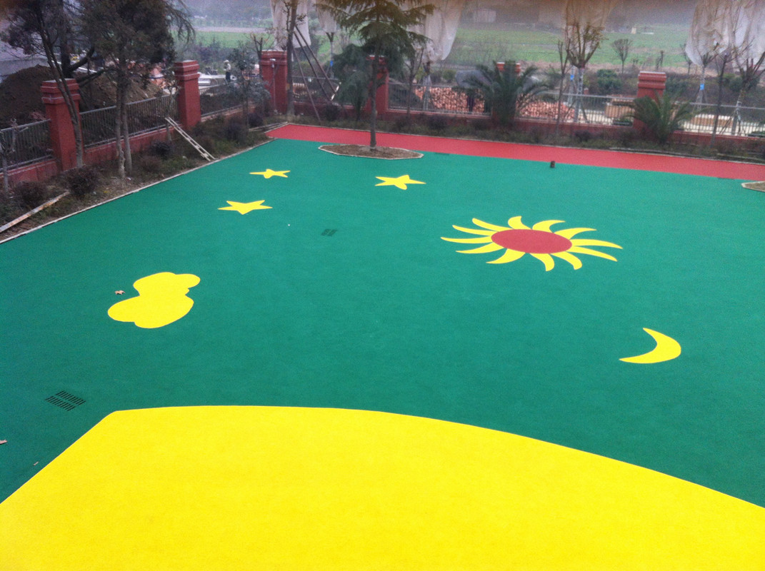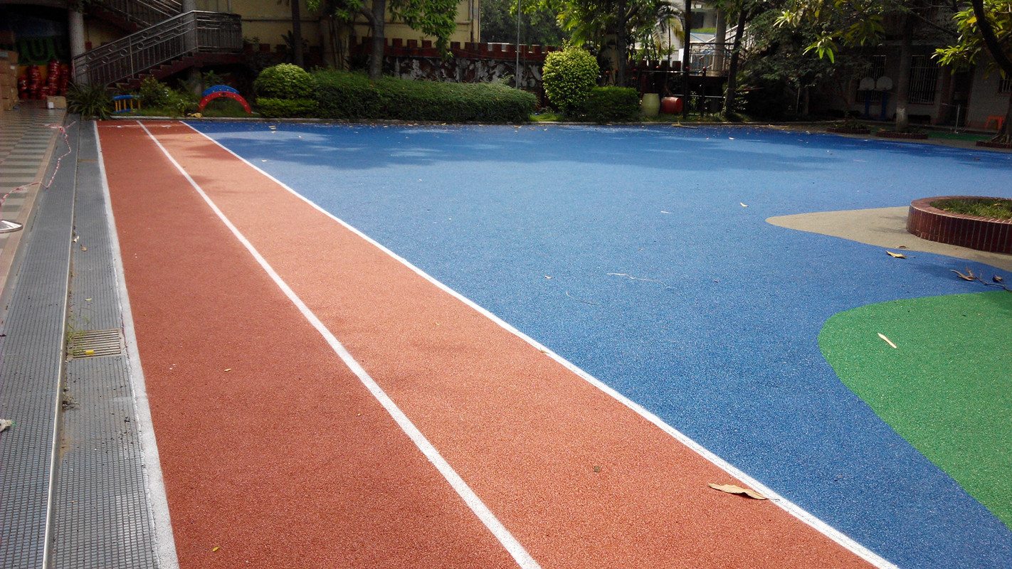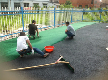 EPDM塑膠球場由高強度、高彈性、強抗紫外線的EPDM顆粒拌和一定比例的單組份膠水,在混凝土或瀝青基礎上直接攤鋪、壓實而成。具有長時間的使用壽命,彈性程度及動力學設計特征。底層由聚氨酯黏合劑按控制比例混合特殊膠粒后,經由專業施工機械控制厚度鋪設。是PU球場的替代產品,具有施工方便,對基礎適應能力強,不容易起皮、起泡等優點。